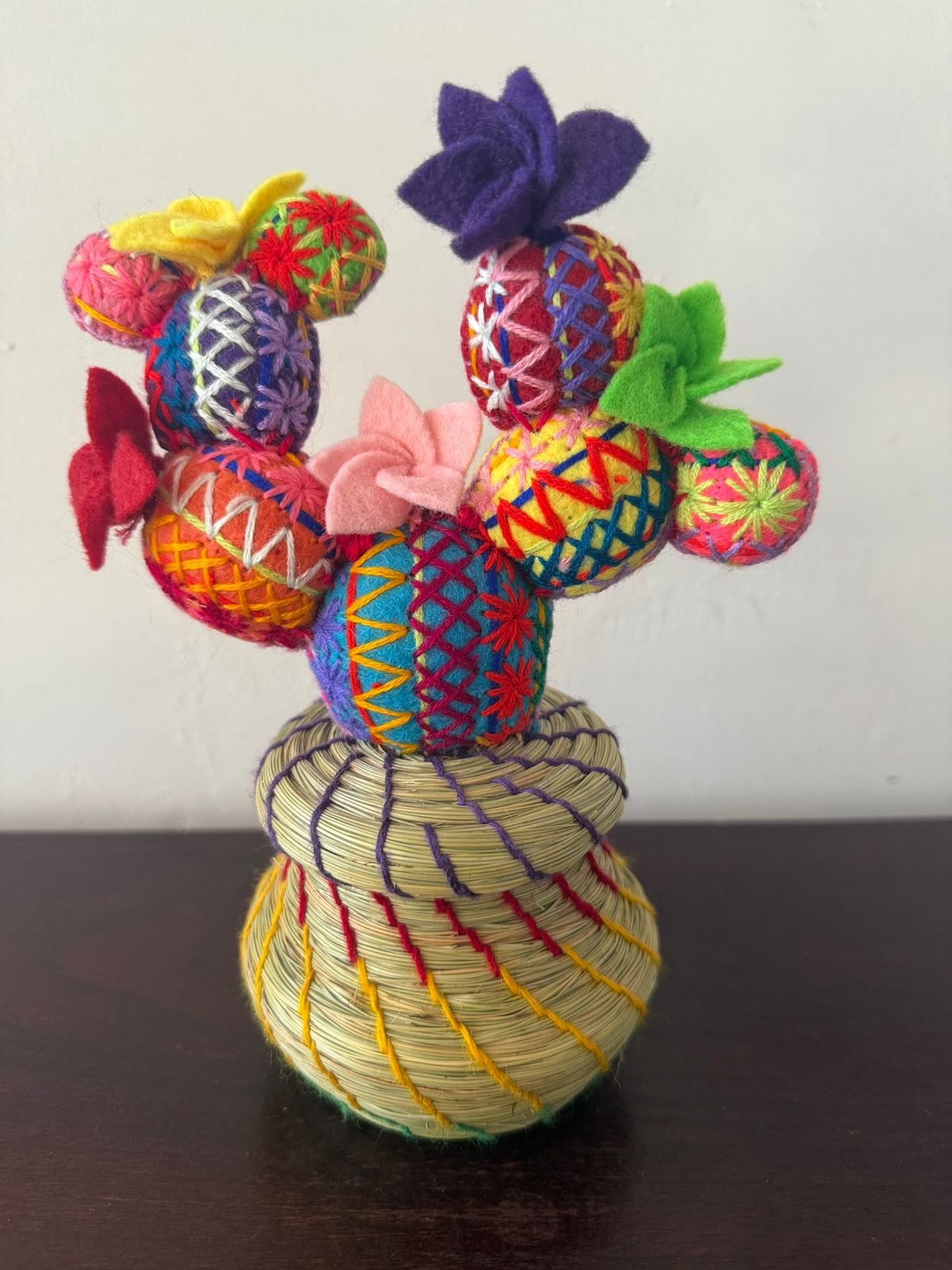 Alhajero de huinumo con bordado de cactus en tela e hilo de estambre. Elaborado por artesanos de San Cristobal de las Casas.