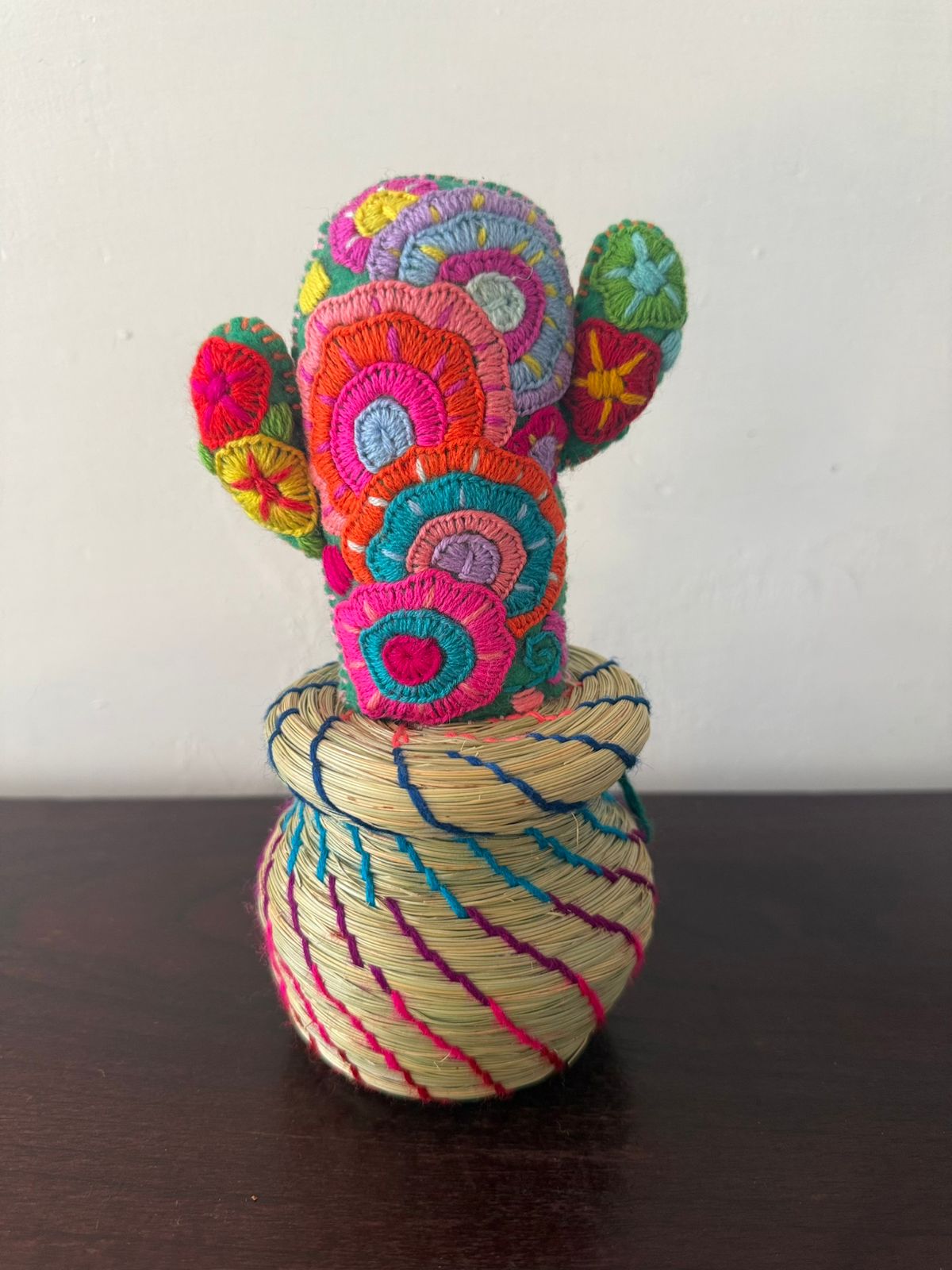 Alhajero de huinumo con bordado de cactus en tela e hilo de estambre. Elaborado por artesanos de San Cristobal de las Casas.
