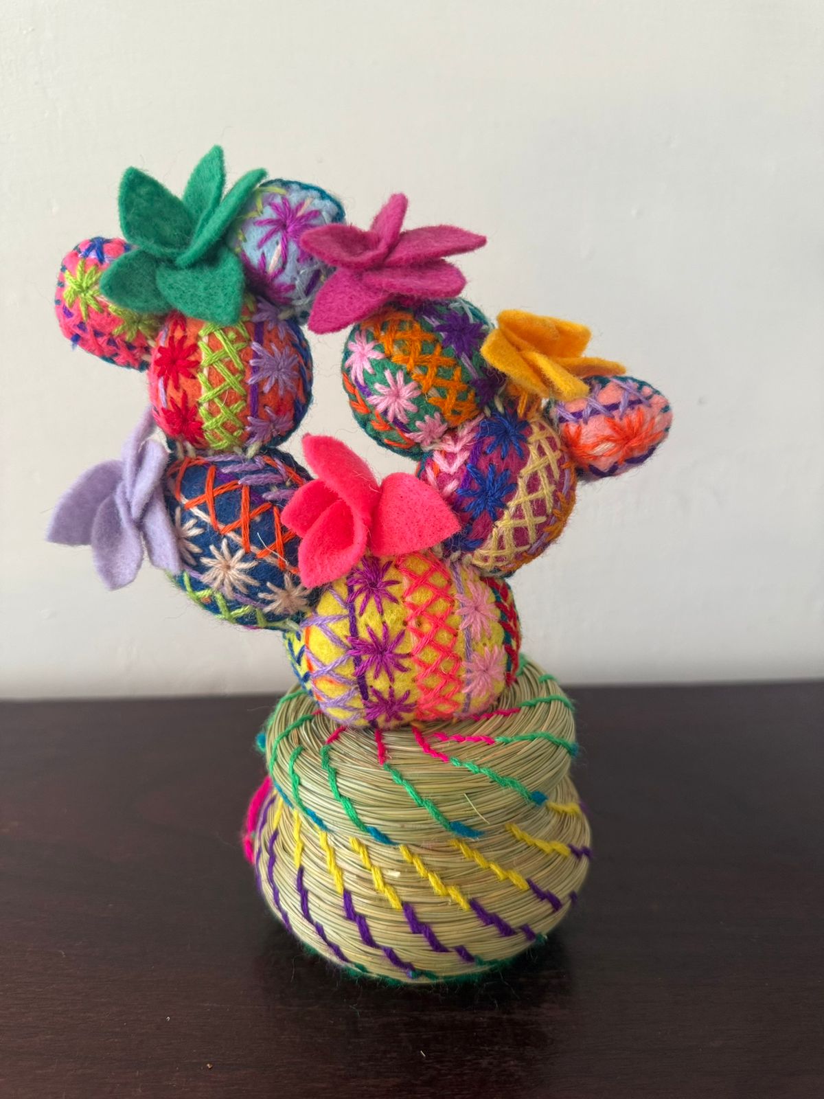 Alhajero de huinumo con bordado de cactus en tela e hilo de estambre. Elaborado por artesanos de San Cristobal de las Casas.