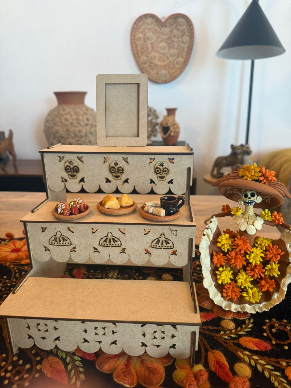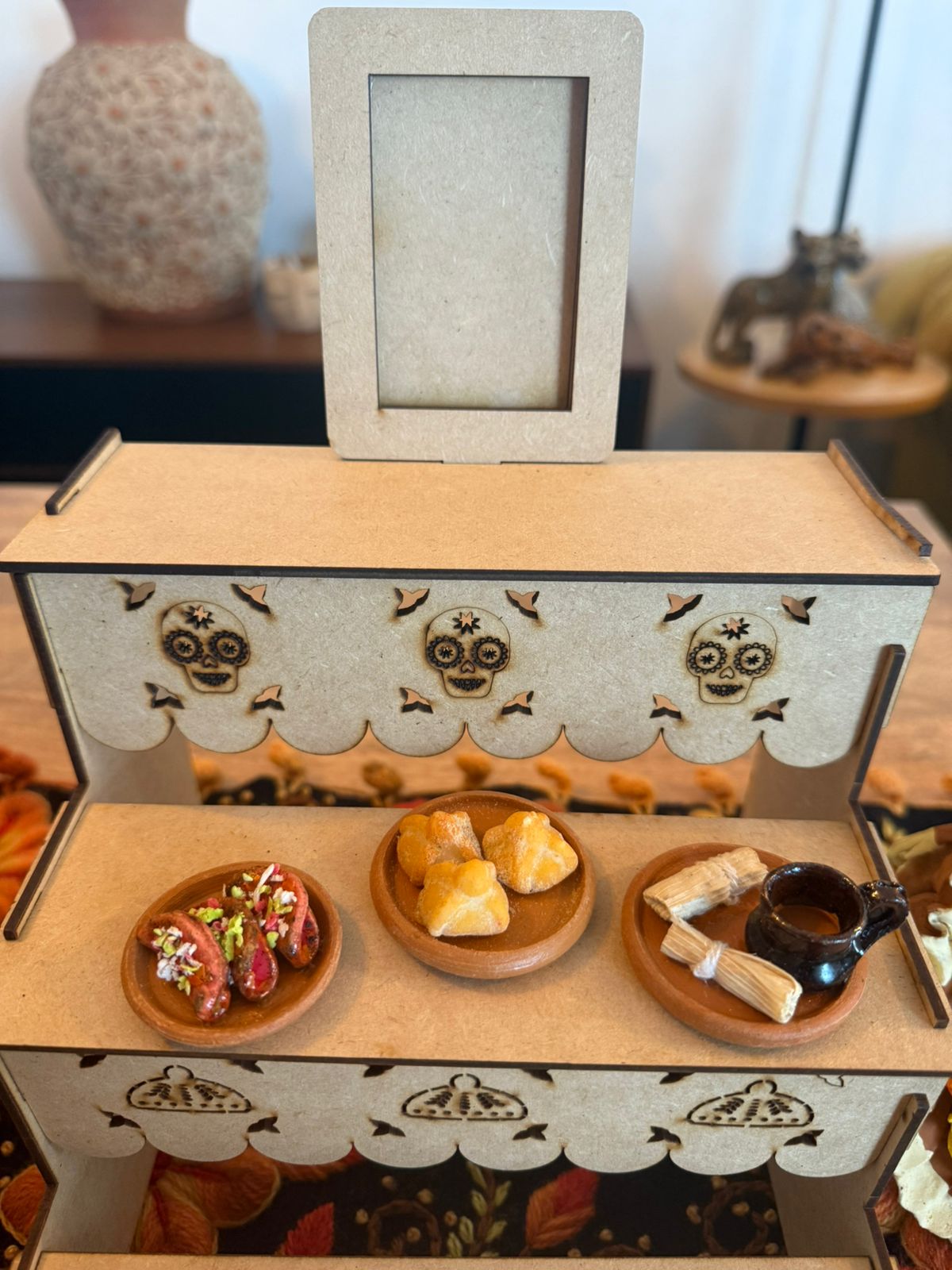 Altar de madera MDF elaborado en Quiroga Michoacán. INCLUYE: 3 platitos de comida variados.