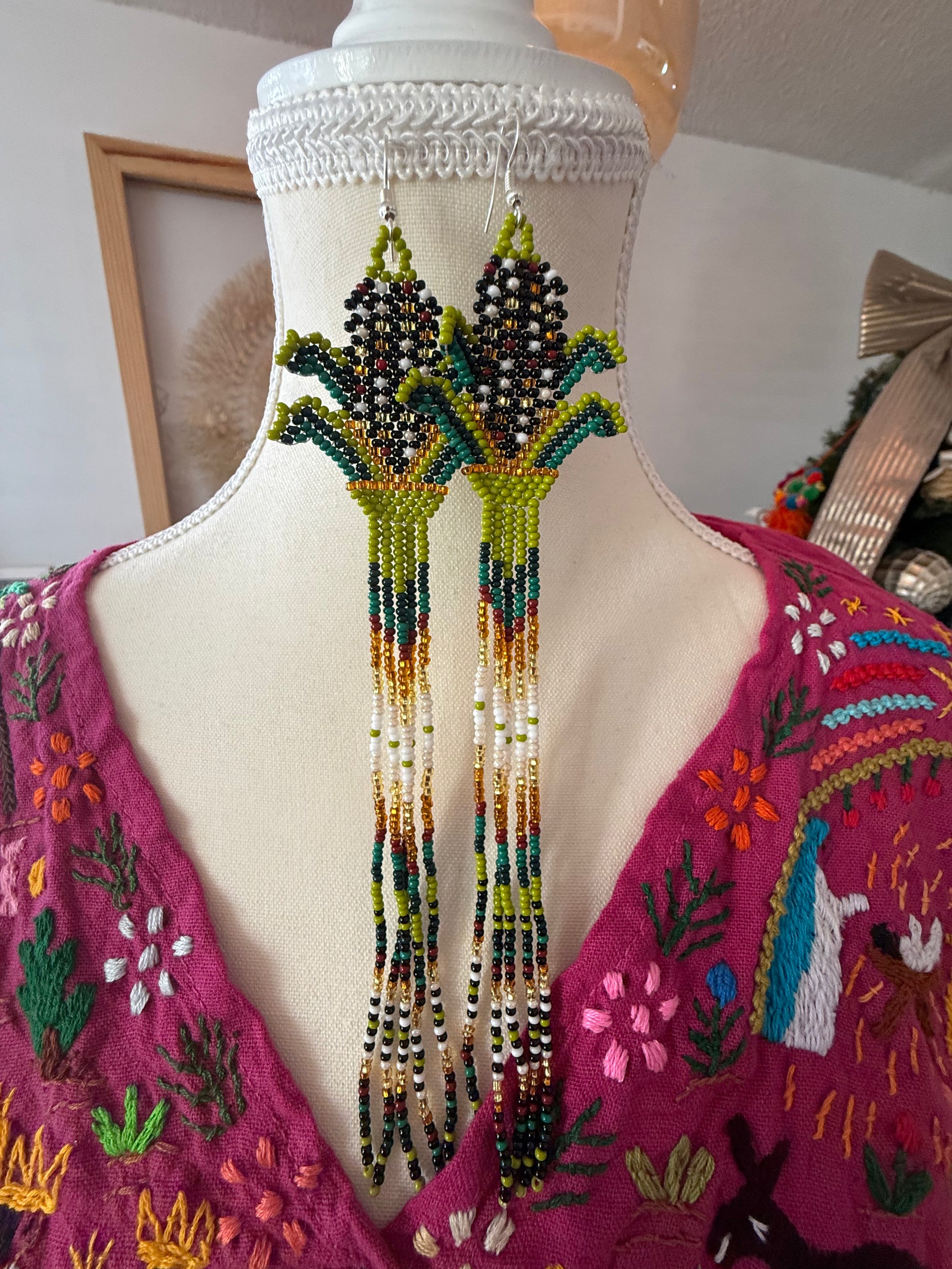 Aretes de chaquira con forma de maíz elaborados porartesanos de Chiapas. Medida de 18 cms de largo.