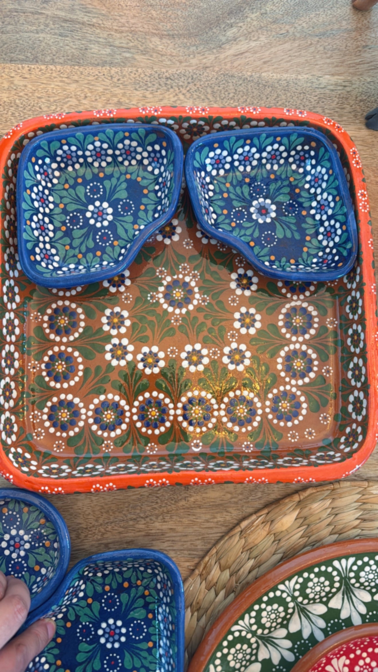 Plato botanero de 27X27 cms finamente pintado. Elaborado por artesanos de Capula. Con 5 compartimentos para tus diversas botanas al centro de la mesa