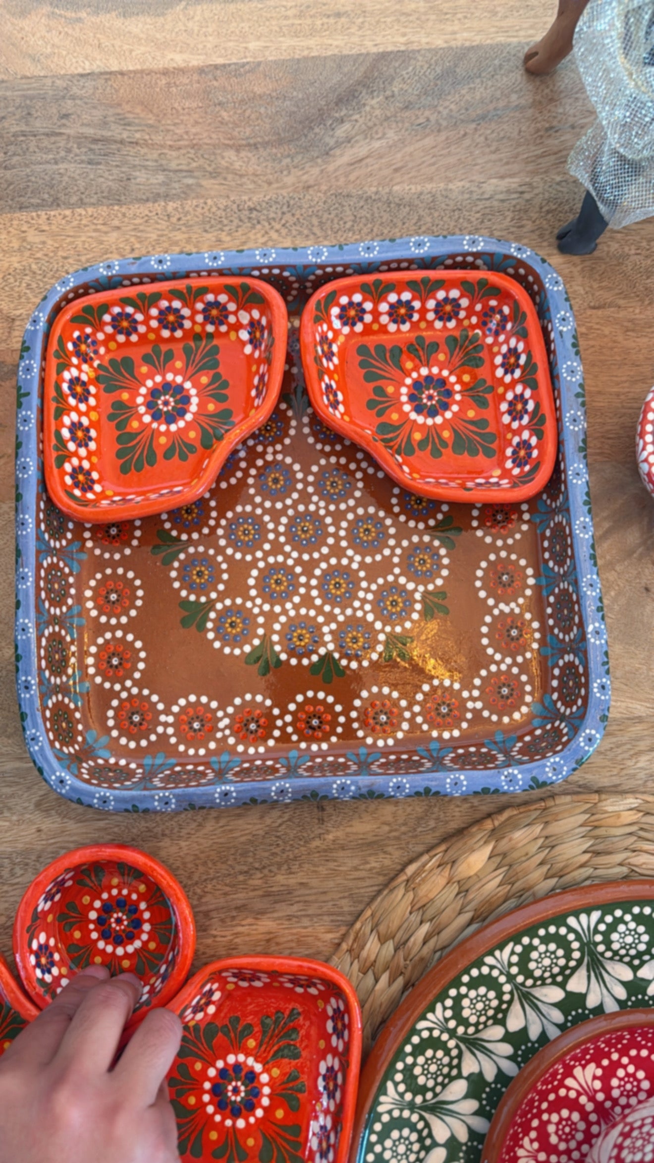 Plato botanero de 27X27 cms finamente pintado. Elaborado por artesanos de Capula. Con 5 compartimentos para tus diversas botanas al centro de la mesa
