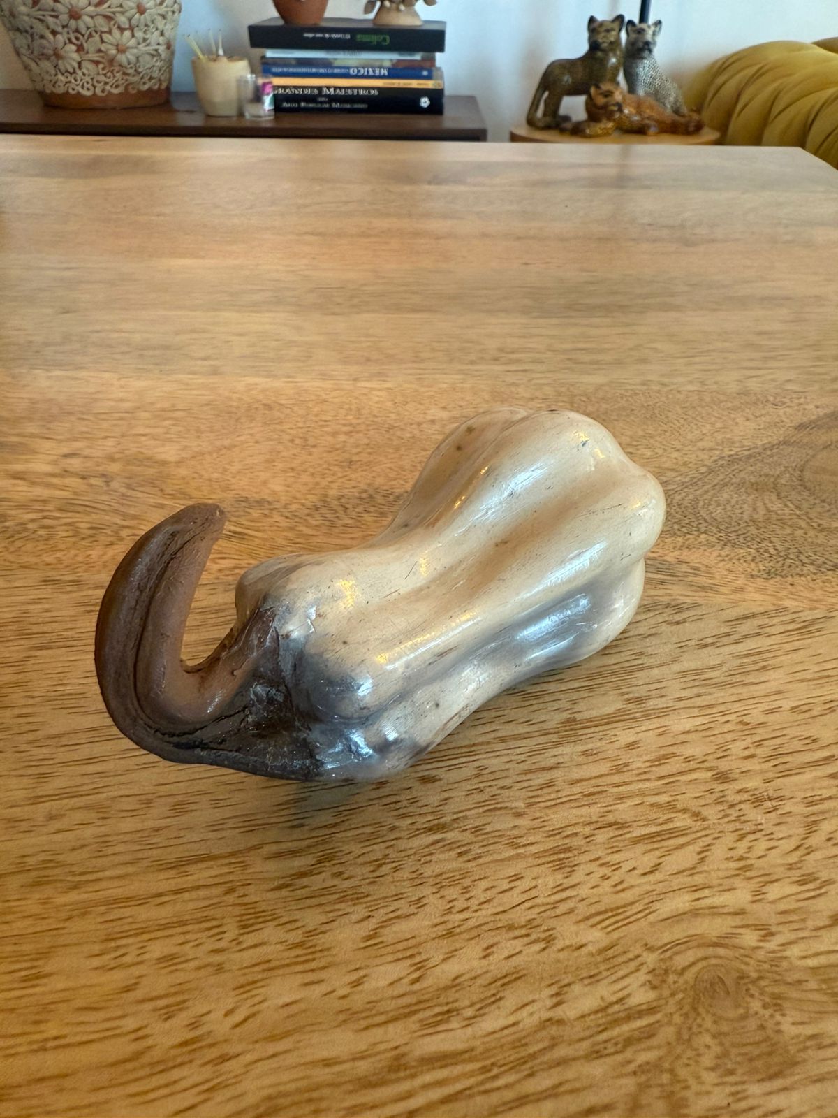 Calabaza de barro elaborada por artesanos de Zinapécuaro. Altura de 5 cms y largo de 13 cms.
