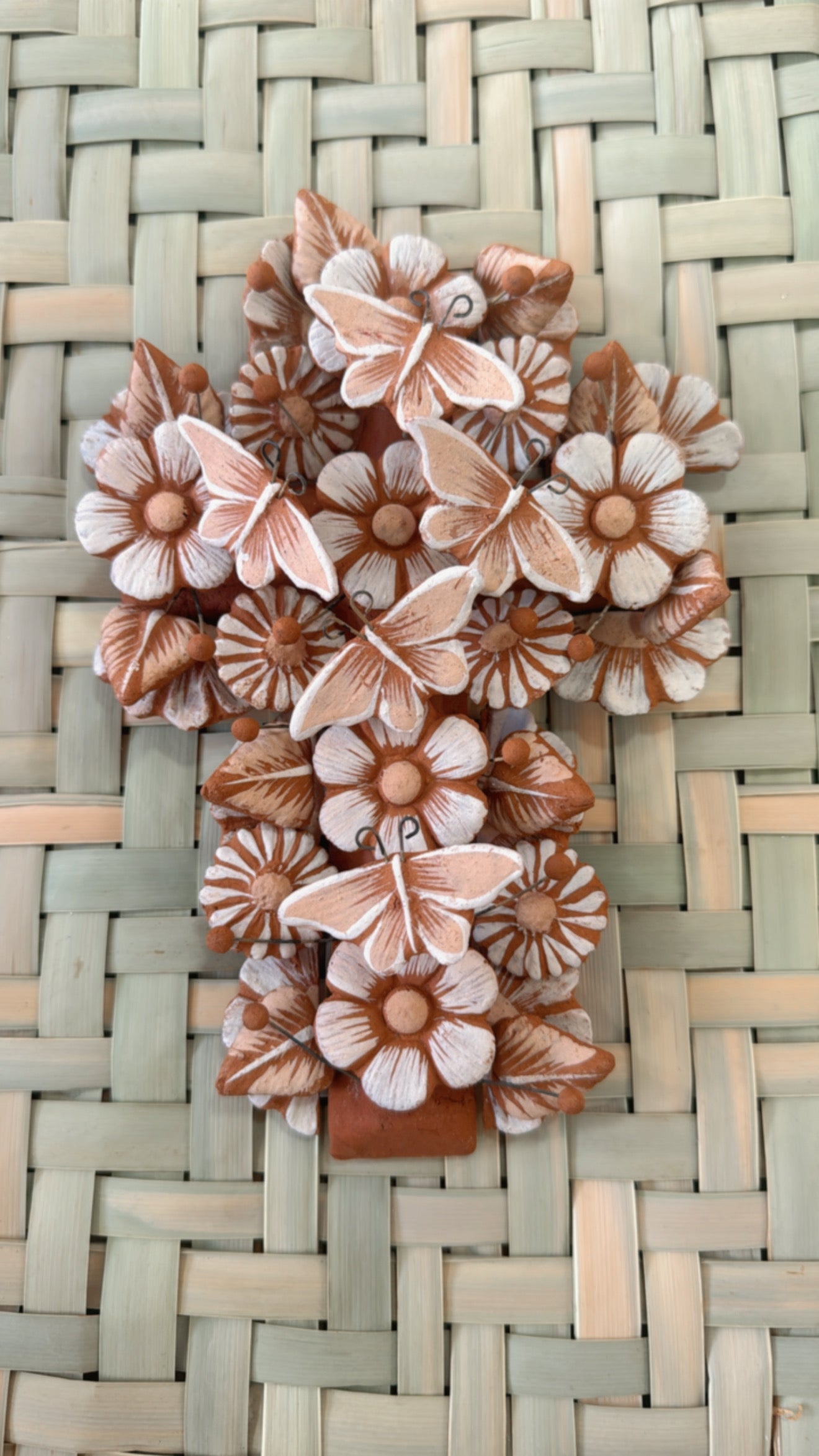 Cruz de 22 centímetros de altura y 15 cms de ancho de flores de colores, elaborados por artesanos de Metepec.