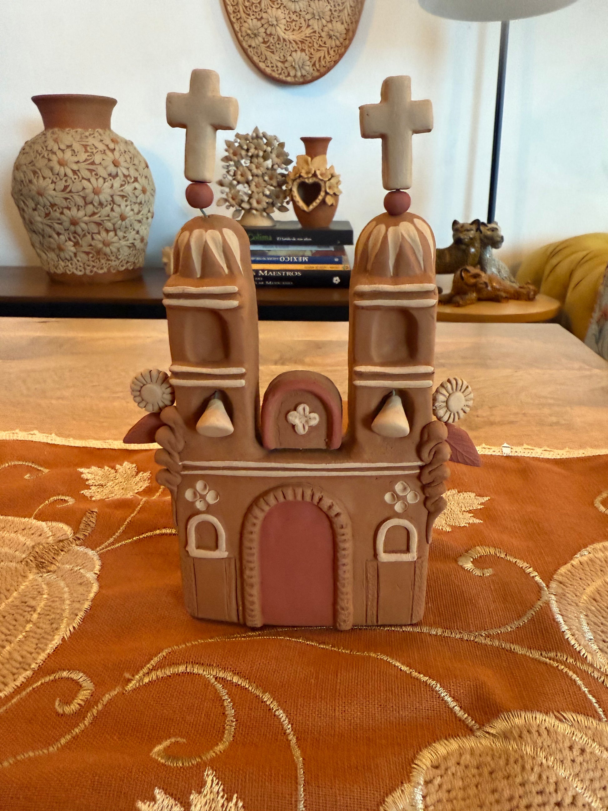 Iglesia de barro de 22 centímetros de altura de flores de colores, elaborados por artesanos de Metepec.