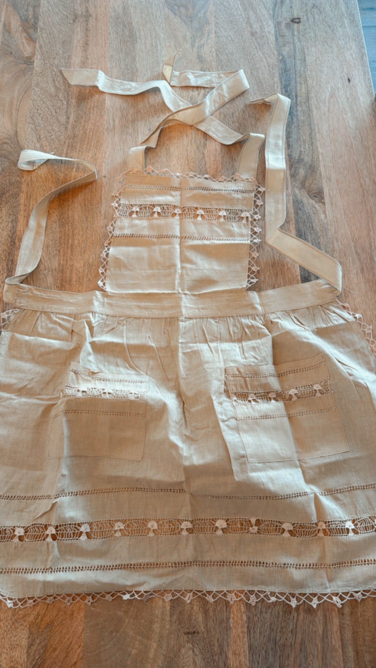 Mandil deshilado, elaborado por artesanos del estado de México, con orilla de crochet; con dos bolsas y ajustable a la talla que desees.