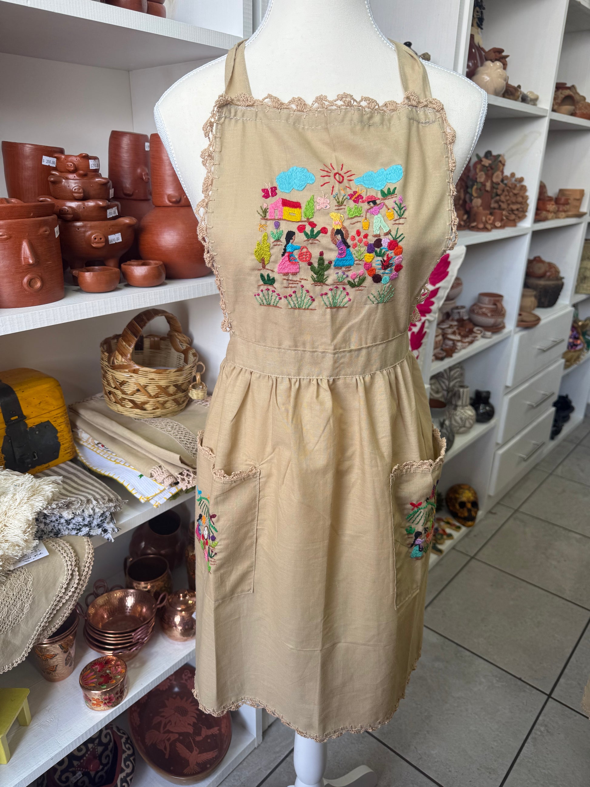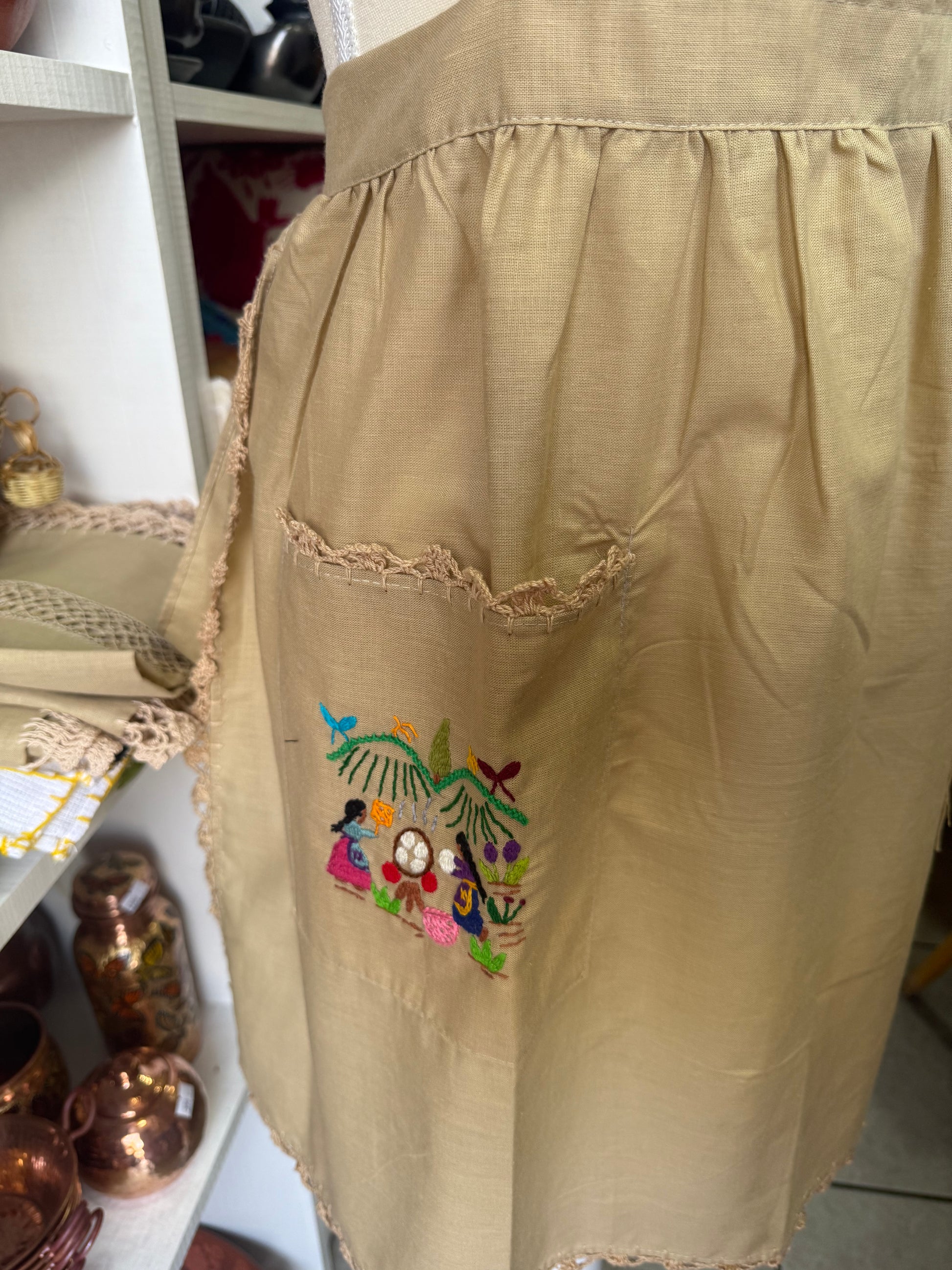 Mandil deshilado, elaborado por artesanos del estado de México, y en combinación con artesanos de Michoacán con dos bolsas y ajustable a la talla que desees.