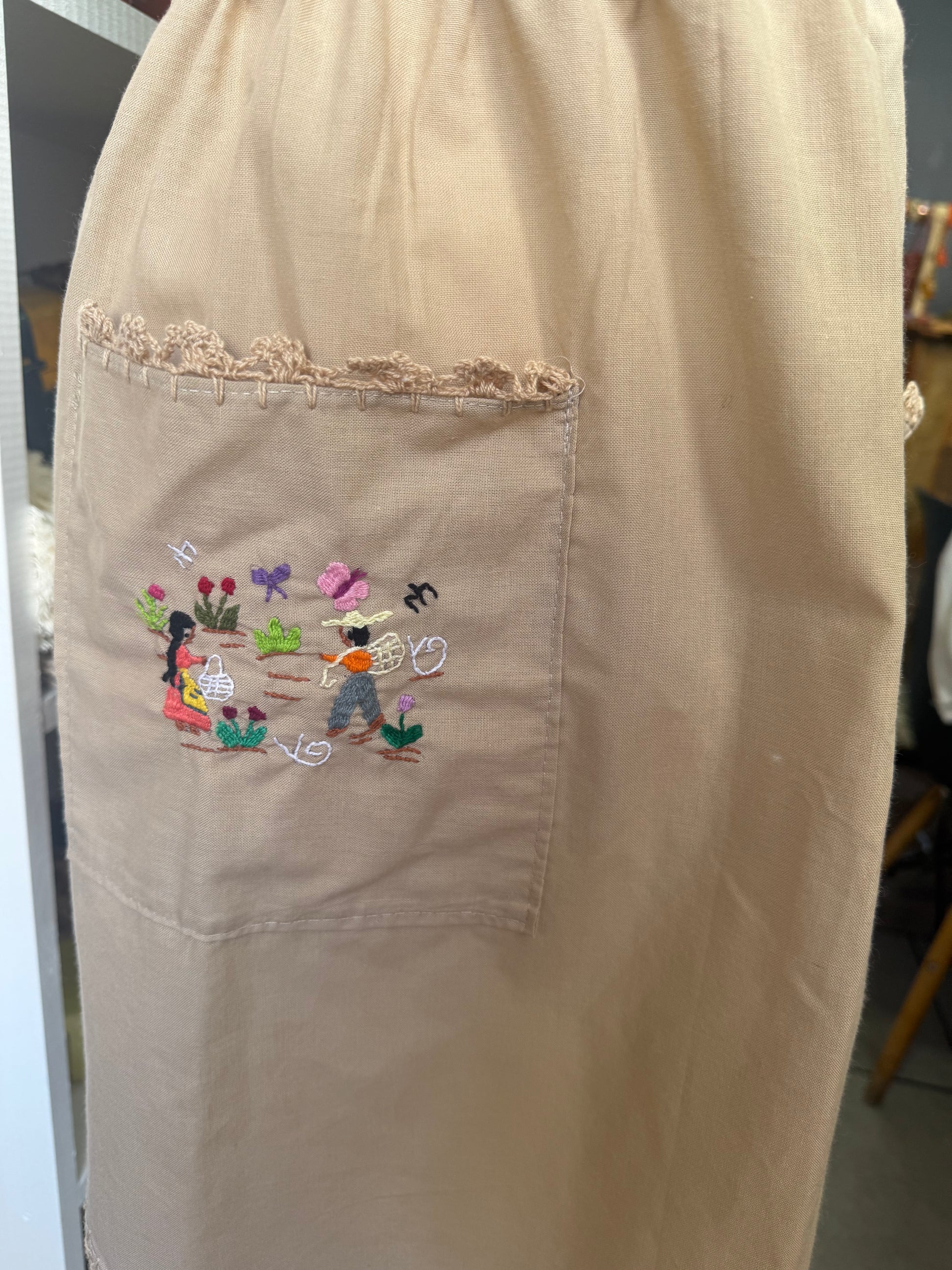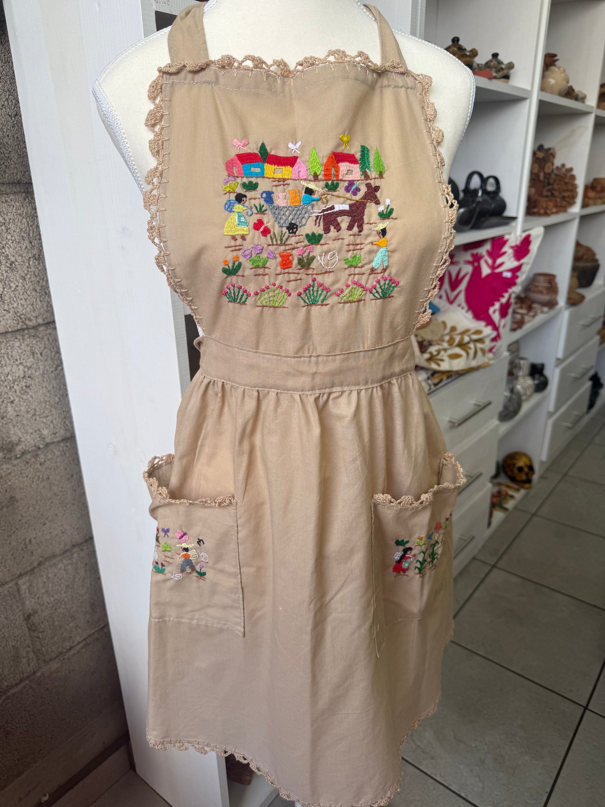 Mandil deshilado, elaborado por artesanos del estado de México, y en combinación con artesanos de Michoacán con dos bolsas y ajustable a la talla que desees.
