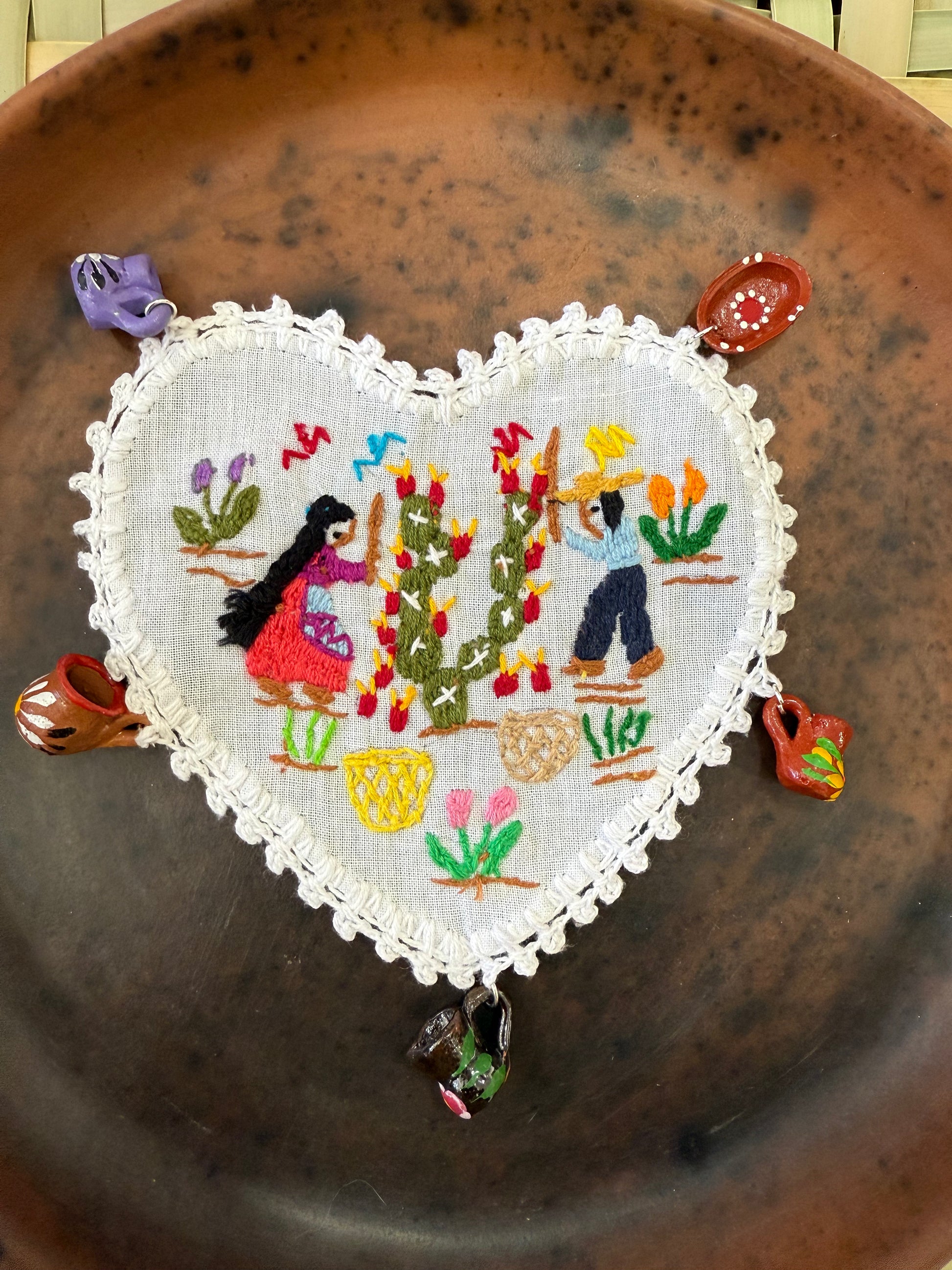 Servilletas de historias bordadas elaboradas por artesanos de Tzintzunzan. Sus medidas son de 14x14 cms.