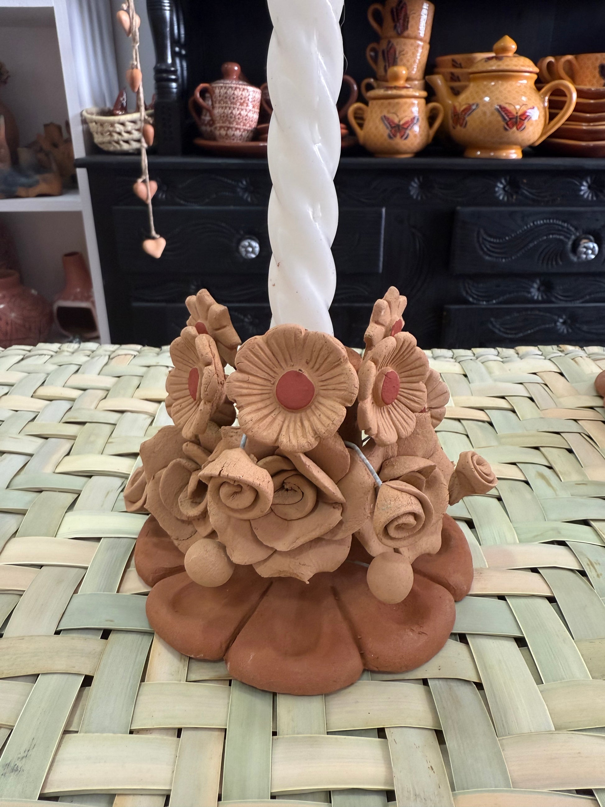Portavela de barro con detalles en flores pigmentadas, hecho a mano, por artesanos de Metepec. Medida de 6 Cms de alto.