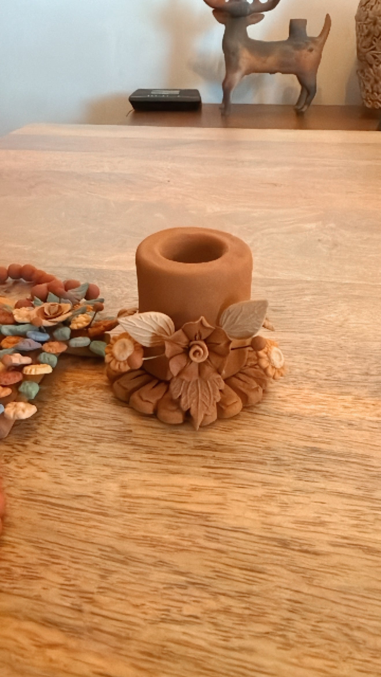 Portavela de barro con detalles en flores pigmentadas, hecho a mano, por artesanos de Metepec. Medida de 6 Cms de alto.