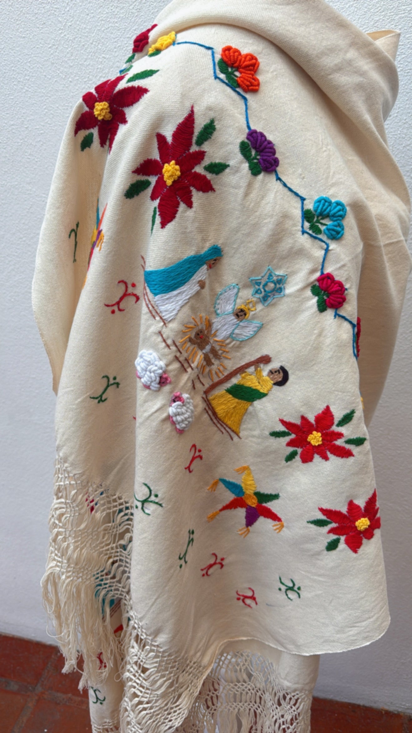 Rebozo de elaborado en telar de pedal, de manta. Bordado a mano de historias de Michoacán con motivo del nacimiento del niño Dios.