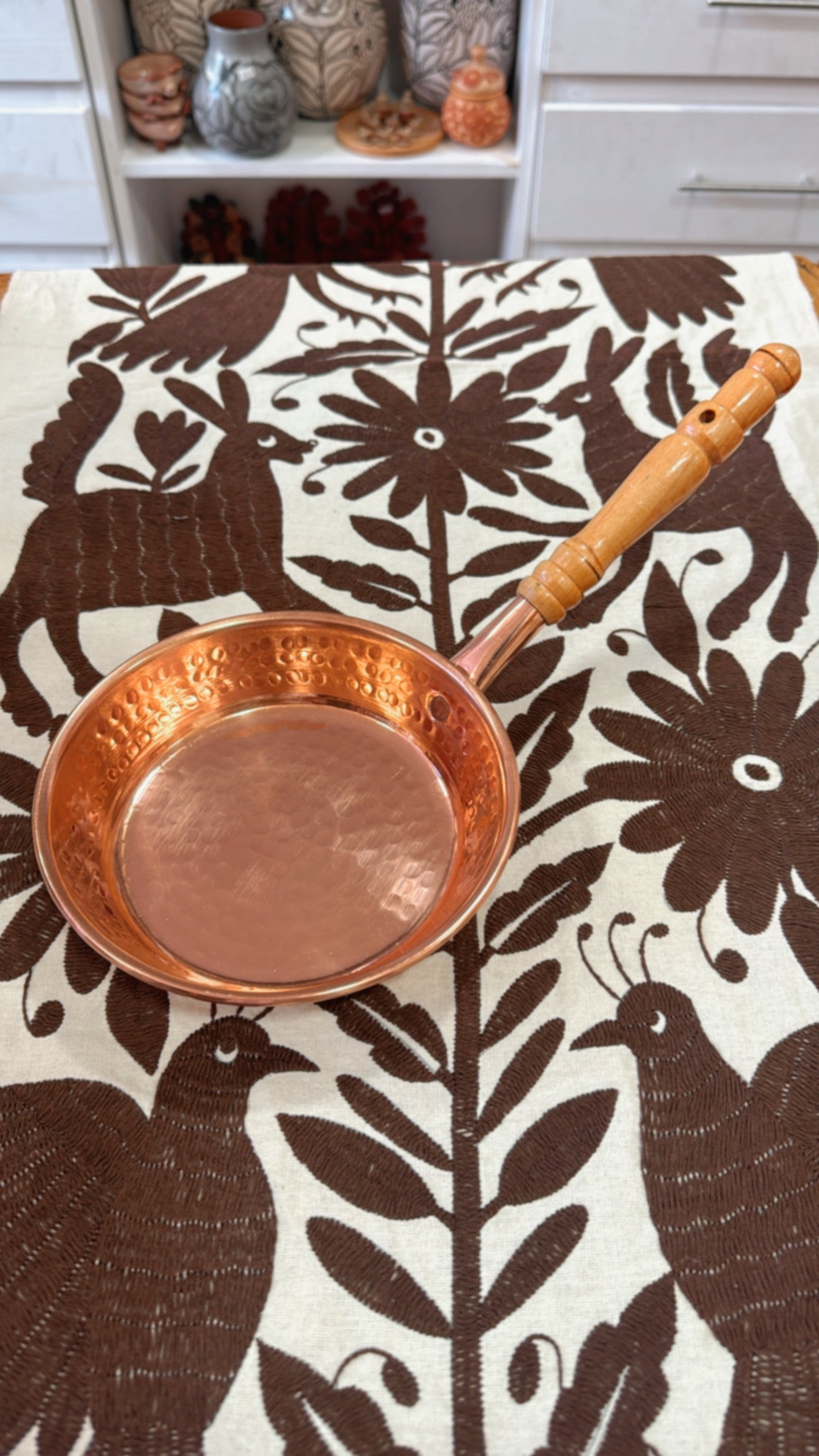 Sartén de cobre con mango de madera elaborado por artesanos de Santa Clara del Cobre Michoacán.
