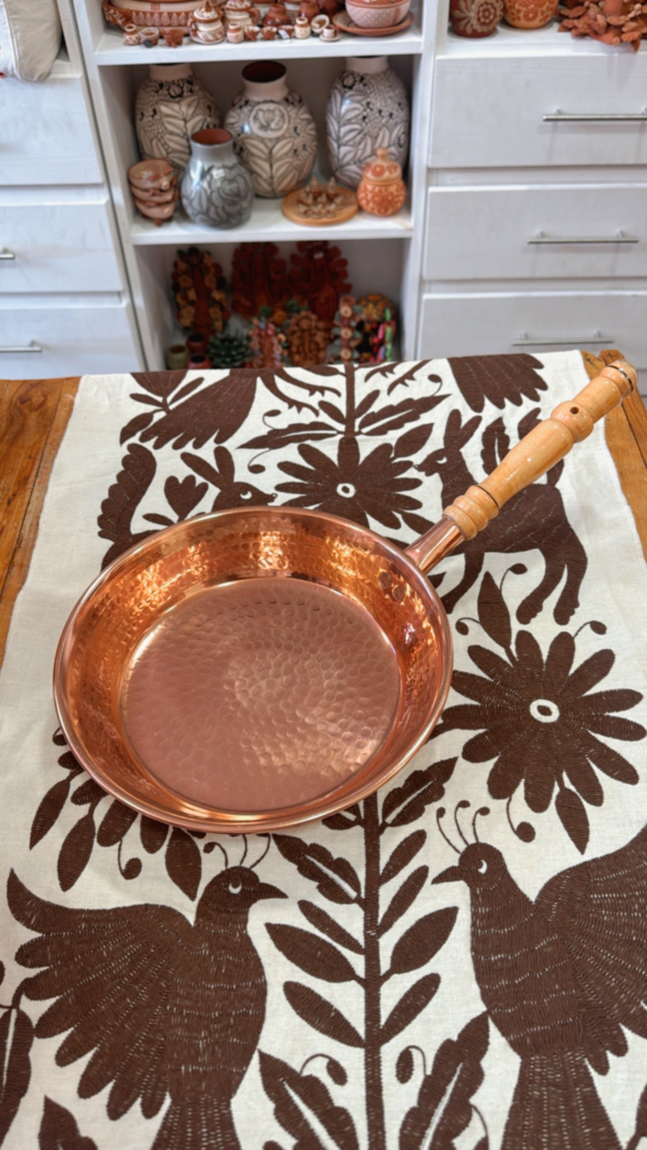Sartén de cobre con mango de madera elaborado por artesanos de Santa Clara del Cobre Michoacán.