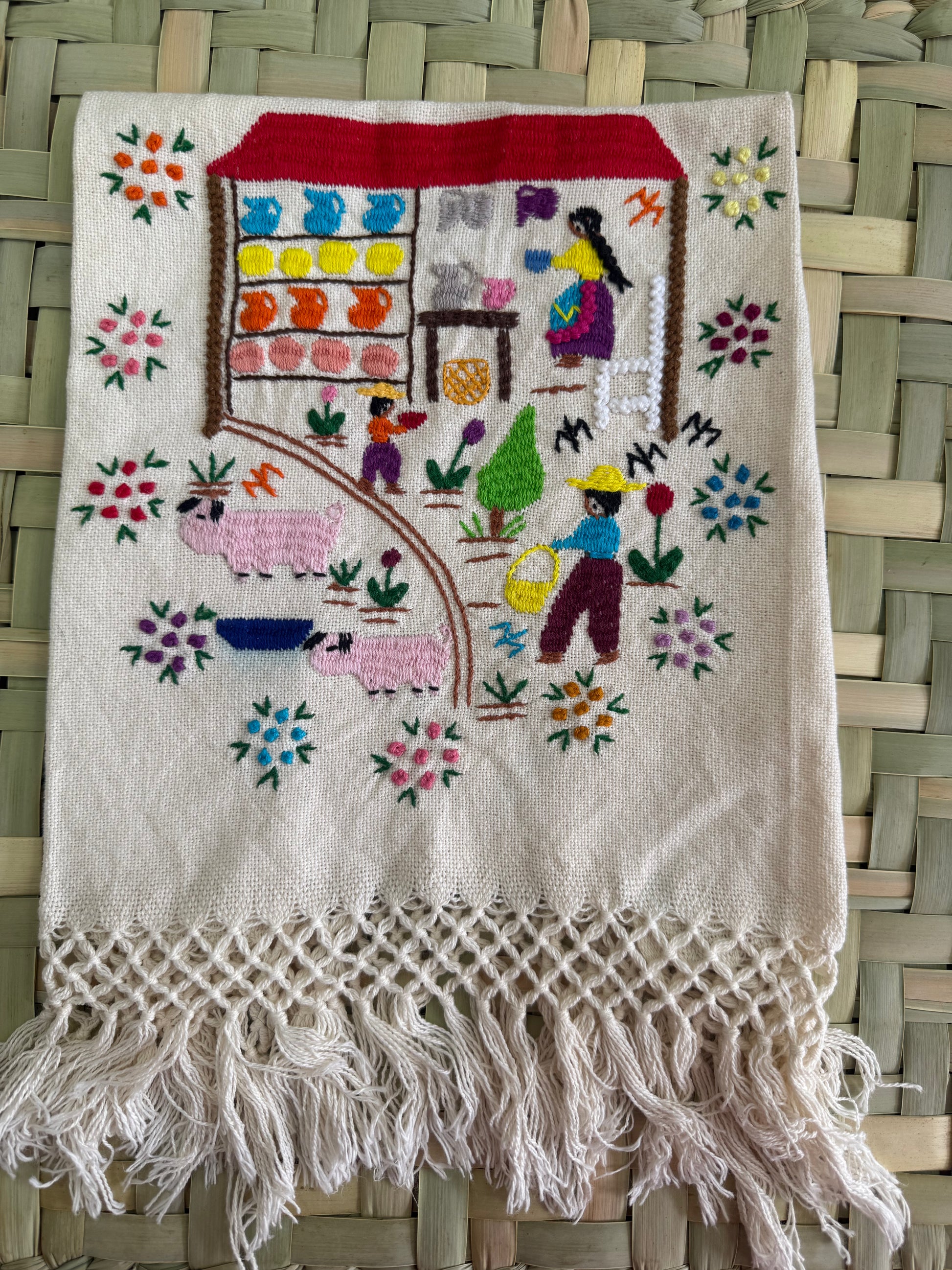 Servilletas de historias bordadas elaboradas por artesanos de Tzintzunzan. Sus medidas son de 38×42 cms sin contar las barbas.
