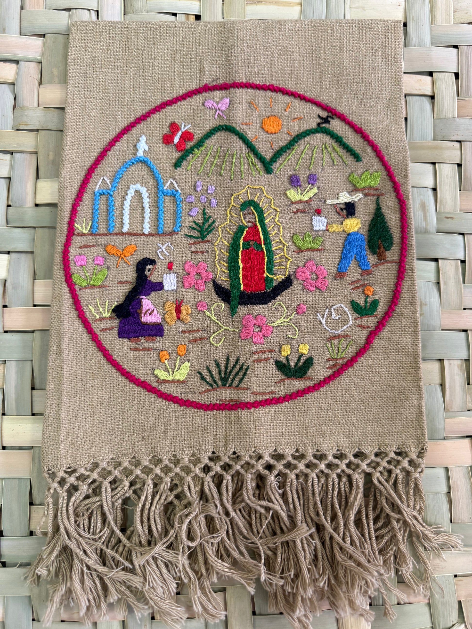Servilletas de historias bordadas elaboradas por artesanos de Tzintzunzan. Sus medidas son de 38×42 cms sin contar las barbas.