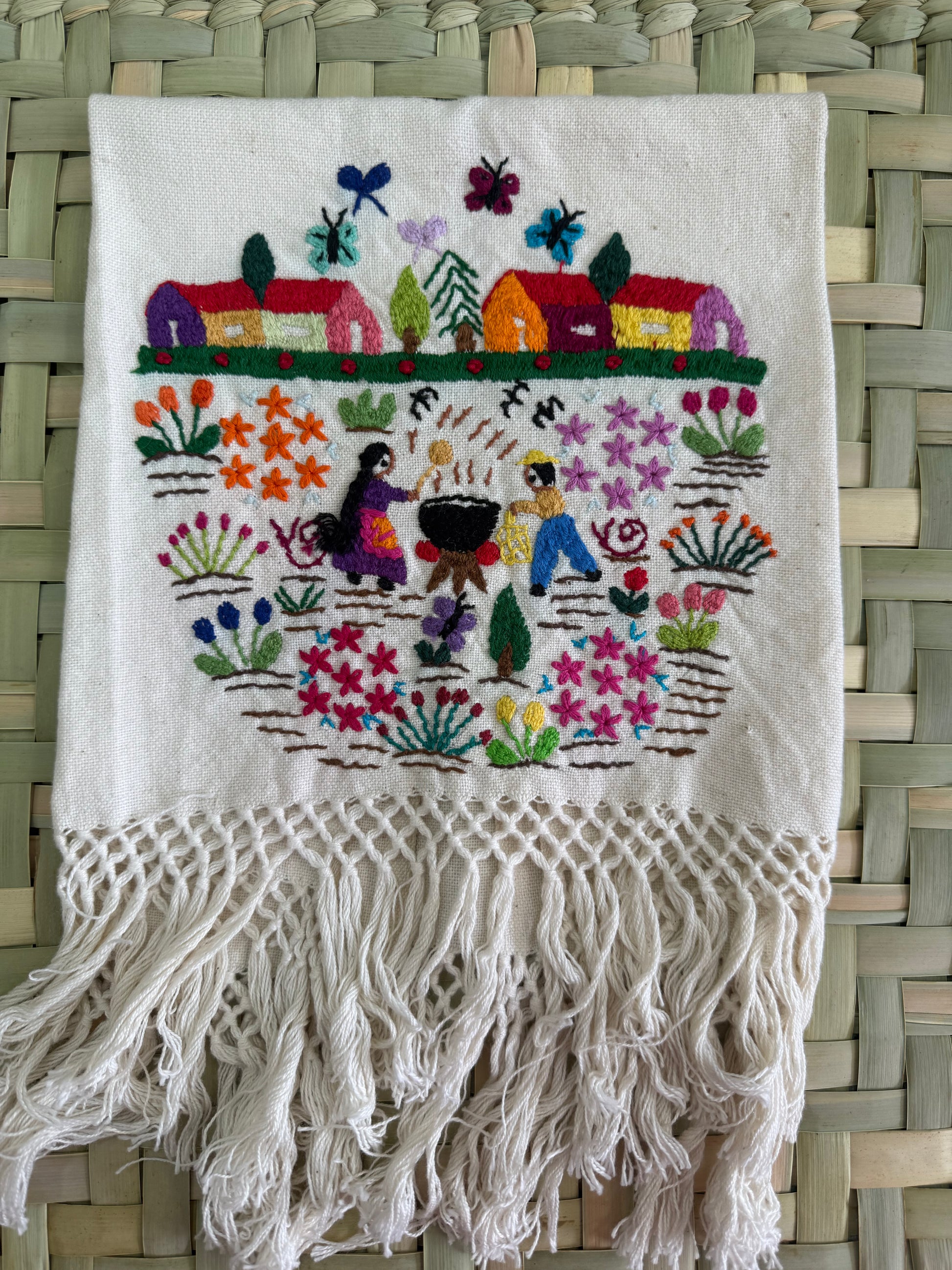 Servilletas de historias bordadas elaboradas por artesanos de Tzintzunzan. Sus medidas son de 38×42 cms sin contar las barbas.