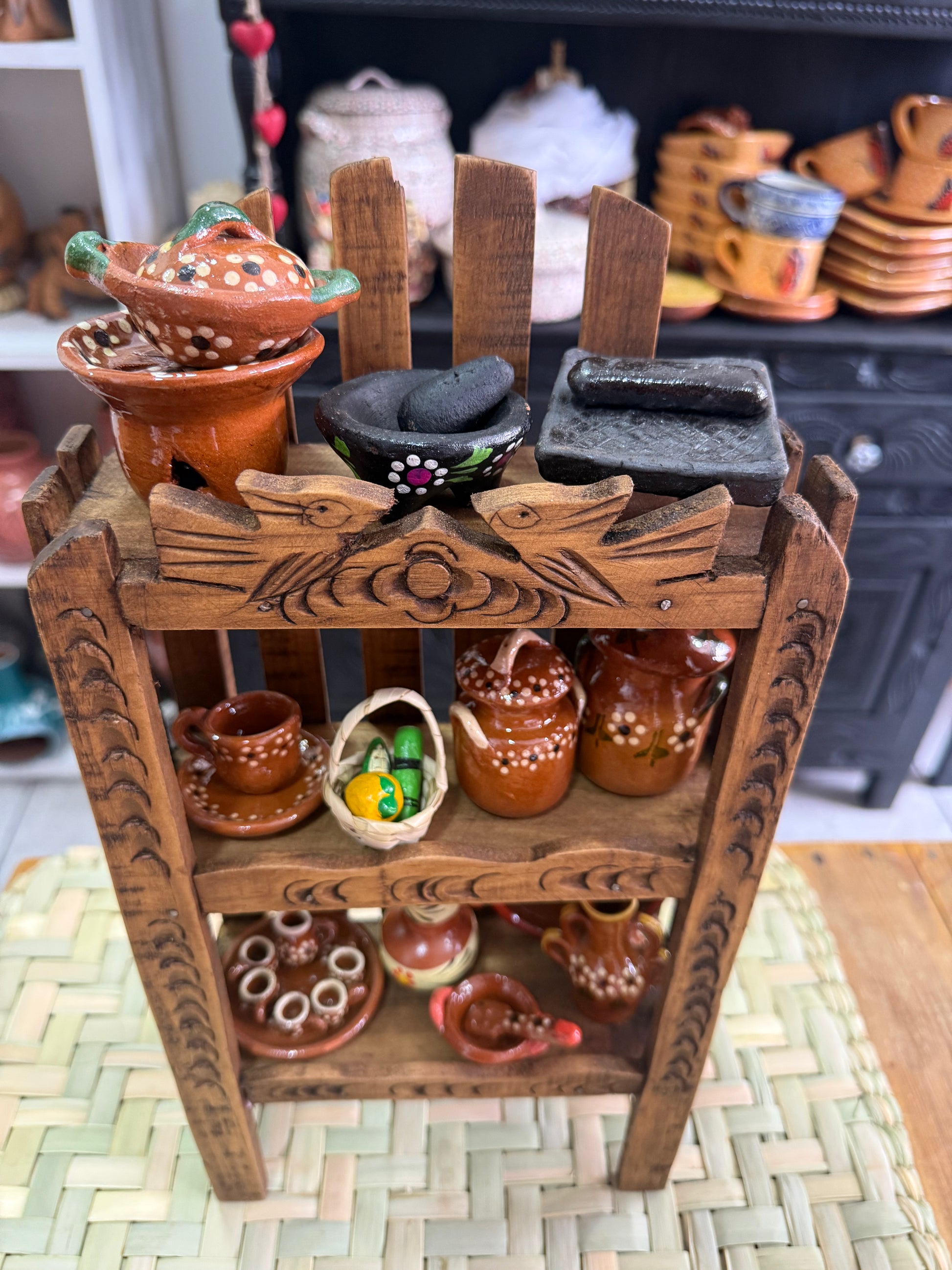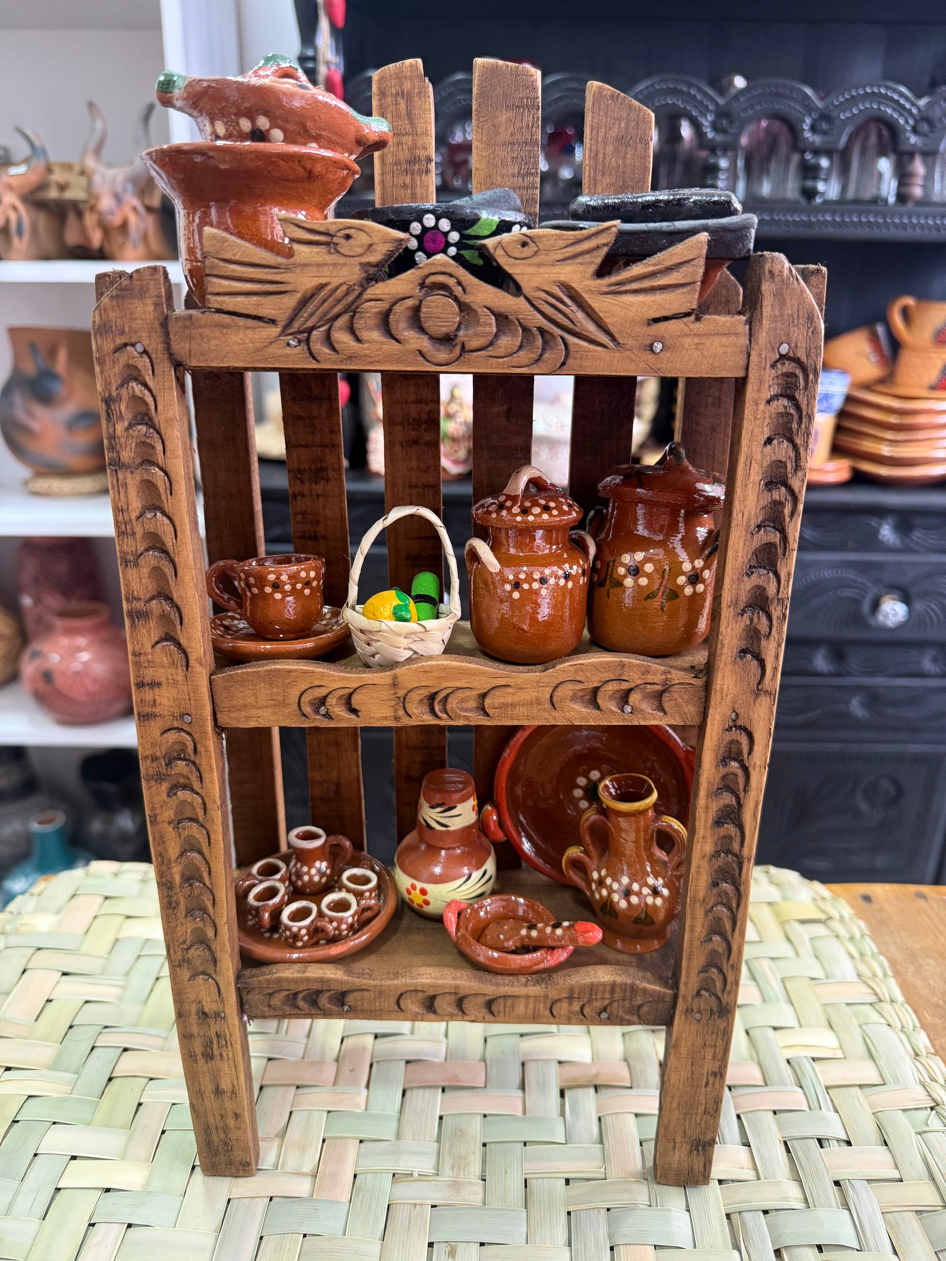 Juego de trasteros de madera hechos y pintados a mano por artesanos de Michoacán. Con una altura de 35 cms aproximadamente. Incluye piezas miniaturas de calidad premium elaboradas por manos michoacanas.
