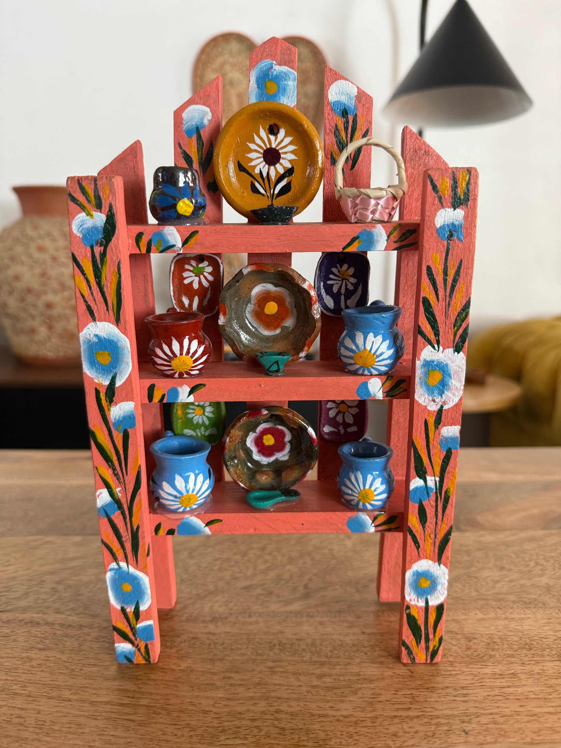 Juego de trasteros de madera hechos y pintados a mano por artesanos de Michoacán. Con una altura sw 25 cms aproximadamente.